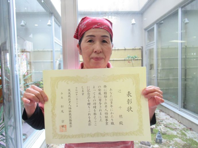 ケアハウス雅からは18年勤続の栄養士の辻千穂さんが表彰され、表彰状と記念品の授与がありました。
