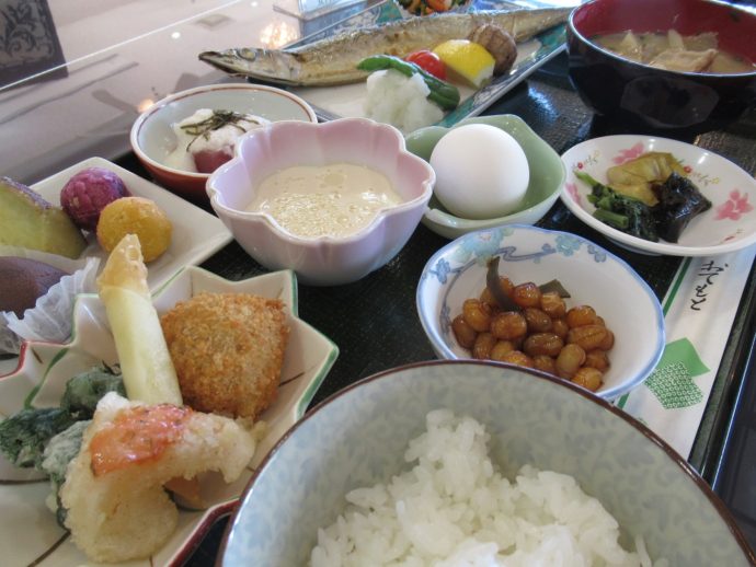・明太子入り里芋コロッケ、たらの芽と海老の天ぷら、チーズ巻き