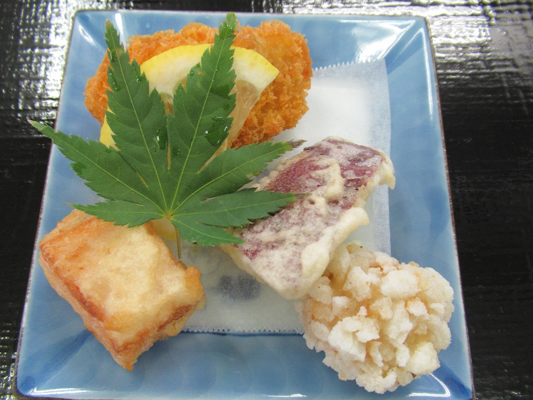 ▲カキフライと天ぷらの盛り合わせ。