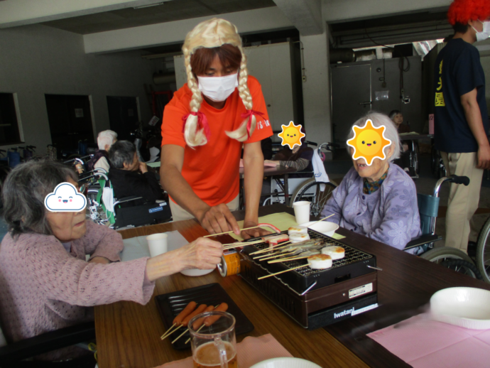 職員はバナナの早食いやラムネ早飲みを、利用者様からの応援を受けて頑張りました