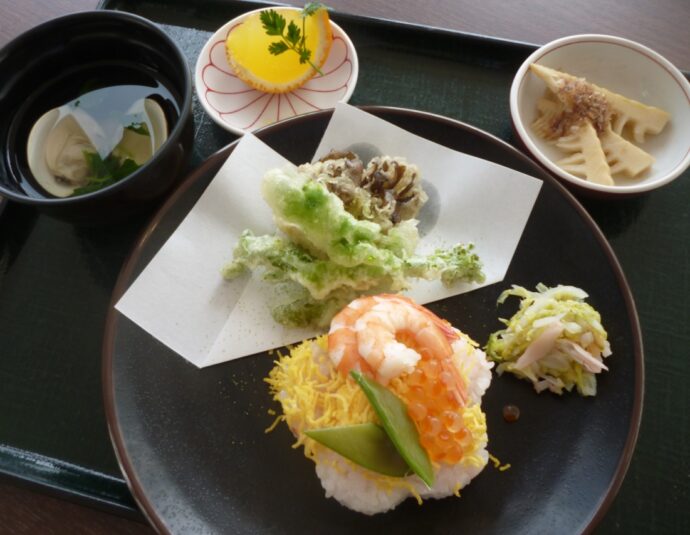 えび、イクラの花形チラシ寿司、筍、菜の花の天ぷらと春爛漫です🌸入社1年目、管理栄養士の平山さんの素晴らしい春のお膳です。私も頂きました。ミカンのゼリーも手作りでフレッシュ!全てに感動しました。