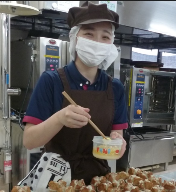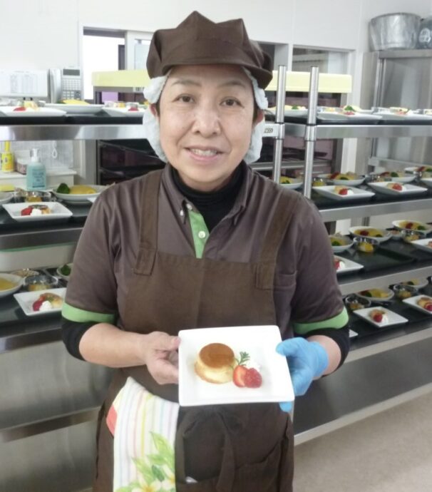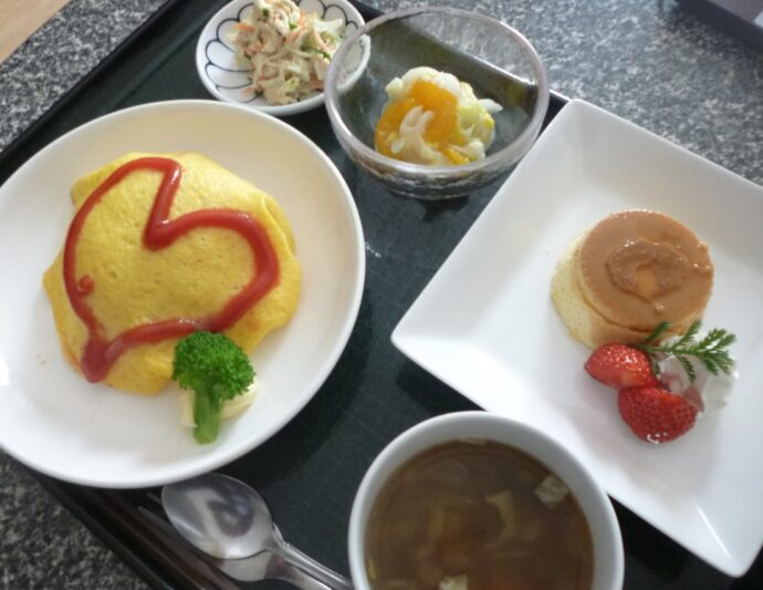 今回はプリンケーキです。いちごとクリーム、厨房畑のローズマリー、プルンプルンでおいしそうですね☺オムライスのハート型のケチャップも可愛いです♡今回のデザート担当は入社5ケ月目の大型新人!古賀さんです。古賀さんは経験豊富で、何にでもチャレンジする優しくパワフルな職員さんです。