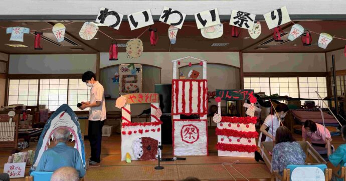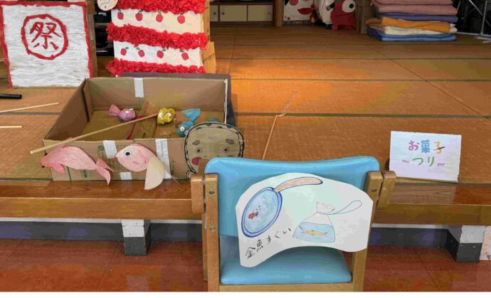 お菓子釣りや職員考案のゲームを行い、利用者様に夏祭りの雰囲気を味わってもらいました。