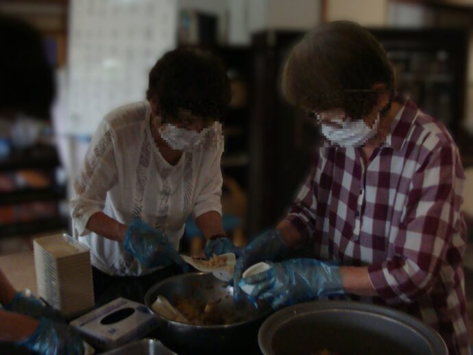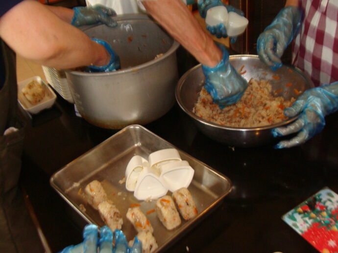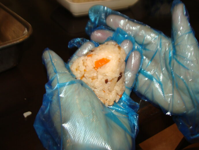 かしわおにぎりは、具を混ぜ合わせた後に、握りました。