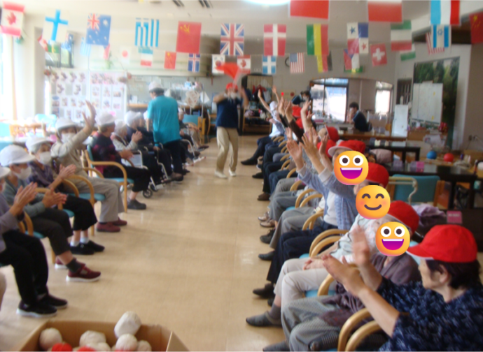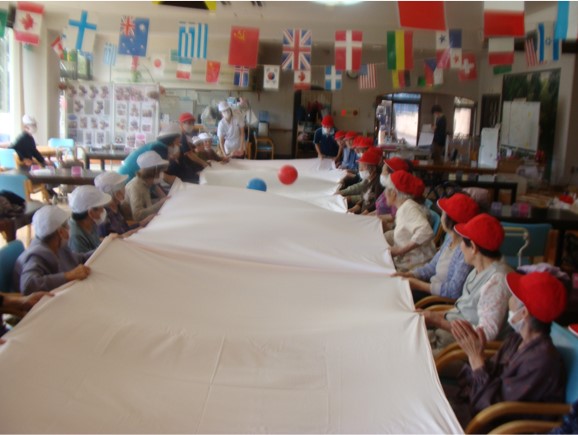 10月23日大運動会を開催しました。利用者、職員を赤組、白組に分け競技を行いました。玉入れのかごが利用者の前を移動して行く競技やシーツを広げボールを赤と白に色分けしゴールまで競う競技、新聞で作った棒で輪っかを隣の方に渡しゴールに運ぶ競技を行いました。勝ったり負けたりしながら大いに盛り上がっていました。