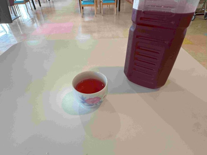 利用者様に赤紫蘇の葉をちぎってもらい、沢山の紫蘇ジュースが完成しました!!
