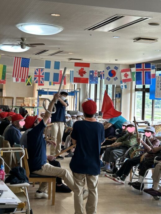 太鼓や鈴を使い、精一杯盛り上げます。毎回職員は汗だくになっていますが(笑)