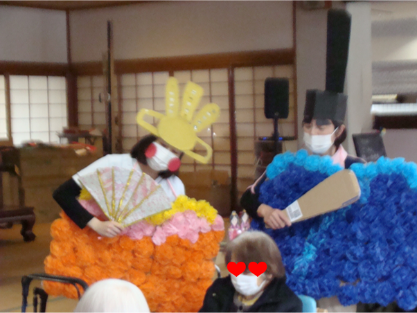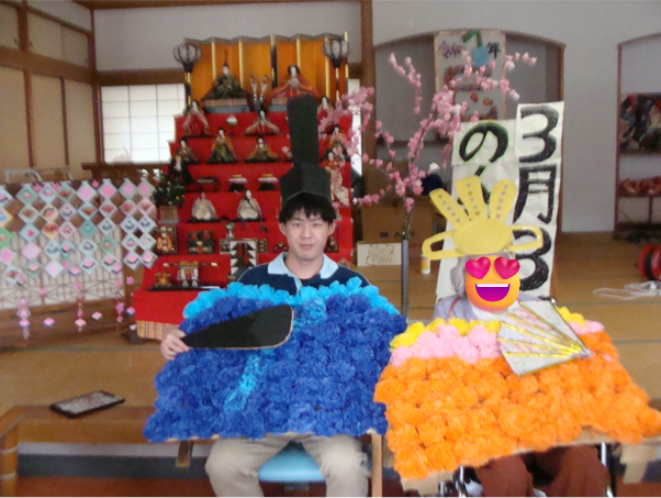 のんびり村でもひな祭りを行いました。お雛様、お内裏様に扮し利用者様と一緒に歌を歌ったり、利用者様にもお雛様、お内裏様に扮していただき写真撮影を行いました。恥ずかしそうにもされている方もいらしゃいましたが、みなさんしっかりすまし顔や笑顔でなりきっていらしゃいました👍