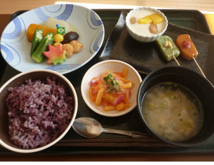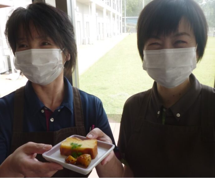 美味しそうです!お腹がぐぅっとなります。厨房の職員さんは食に対して誠実で真剣です。「入居者様の笑顔が見たくて」と真心いっぱいです。最後に、厨房の平井副主任と末武さんの温かい笑顔を皆様に送ります。