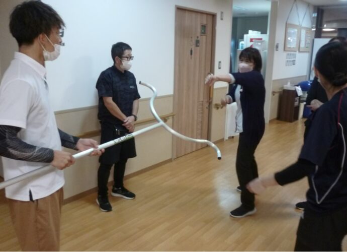 さすまたの使い方の実演です。上半身を狙うなど説明を受け、橋本リーダーが「もし、ねじられたら?」と積極的に質問しています。次は夜間火災を想定した訓練です。