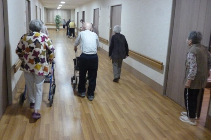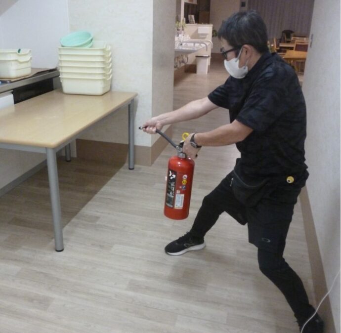 入居者様も積極的に避難訓練に参加されました。「2階で火災発生が発生しました!避難してください」と自動館内音声が大音量で鳴り響きます。避難開始です。