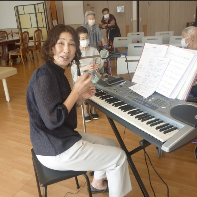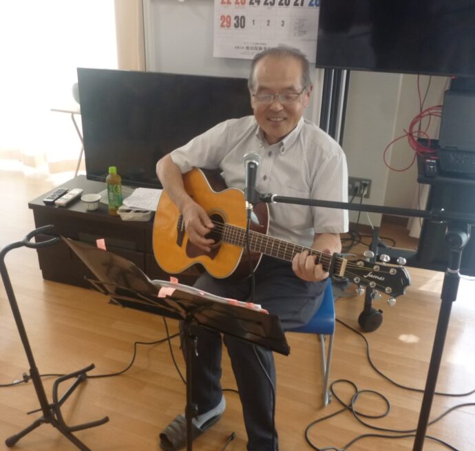 歌は心の引き出し。歌は、流行った時代へとタイムスリップさせてくれます。今回は、丘を越えて、せんせい、愛燦燦、上を向いて歩こうなど全10曲を歌いました♪ボランティアの池邉さんがギターを弾き、愛光園の職員、三田副主任がキーボードを演奏してくれました。