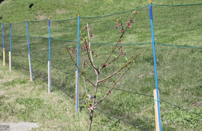 しかし・・・一つ問題が!梨ノ木城のまわりには鹿がいます。アーモンドの葉や花を食べてしまうそうです。大自然との戦い‼がんばります。