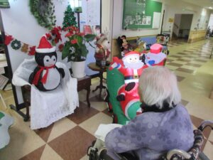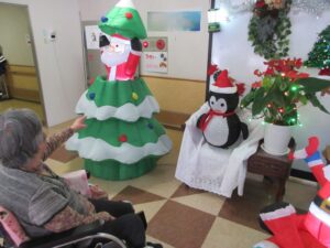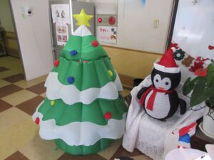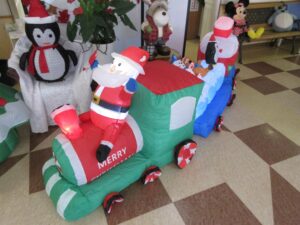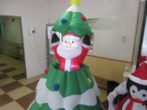愛光園ではクリスマスの時期になると玄関内にクリスマスの飾りつけをしています。今年は新たに1つエアブロードールが仲間入りしました。😆