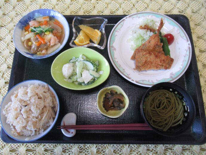 きの子ご飯、アジフライ、豆腐のあんかけ、セロリのサラダ、ゴーヤの佃煮