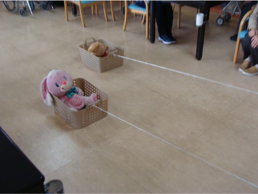 ぬいぐるみを入れたかごに手元まで伸ばした紐を結び、ラップの芯に巻き付けて引き寄せるゲームです。手首をしっかり動かしぬいぐるみを引き寄せます。