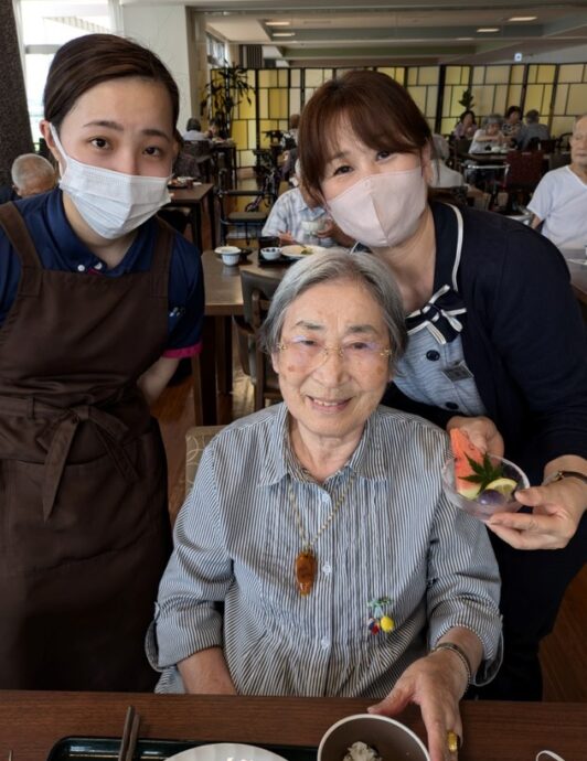 厨房の平井管理栄養士、事務の岡部さんも嬉しそうですね。ご入居者様の喜ばれる顔が見たくて職員一同 頑張っています💪