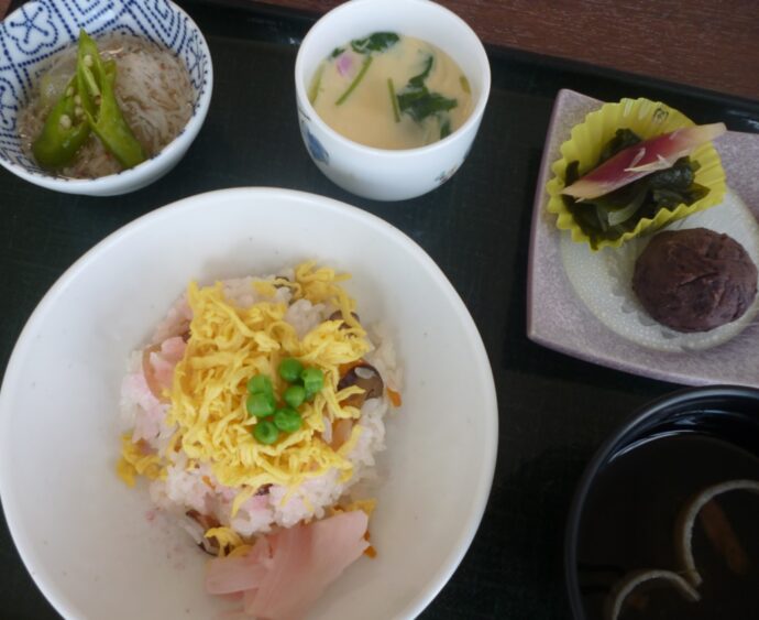 イベントなど特別でない日のお昼ごはんです。茶碗蒸し、おはぎ、ちらし寿司、旬のみょうがも添えられています。
