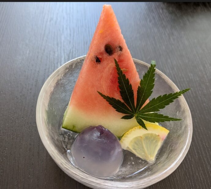 「デザートとコーヒーの日」のデザート、ブルーベリーの水まんじゅうです。夏らしくて涼やか。スイカも冷え冷えです。