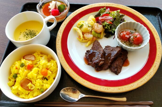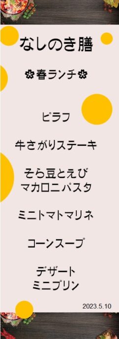 5月10日は月に一度の「なしのき膳」の日でした。今回の主役はステーキ! お肉は柔らか~く、手作りソースと絶妙なハーモニーを奏でデリシャス!
