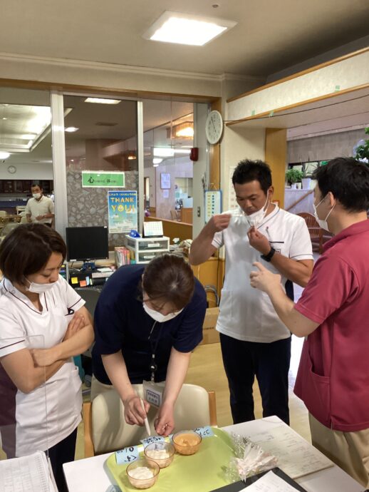 管理栄養士、調理師、言語聴覚士、作業療法士が集まって、補助食品の試食が始まりました。
