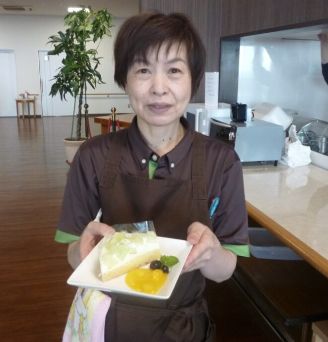 午前中は雷や突風が吹き荒れかなりの大雨でした。梨ノ木城の入居者様は各々の時間を楽しまれ午後からは温泉を満喫されていました。外の豪雨を見ながら「避難しなくてもいいから安心です」とホッとされていました。今日はお待ちかねコーヒーとデザートの日です。担当はわれらが厨房リーダーの平井さん。主役のデザートは「レアチーズケーキマンゴーソース添え」です。初夏にぴったりの爽やかなグリーンが鮮やかです。そのグリーンの正体はメロン!フレッシュなメロンがた~ぷり!キラキラつやつや!ちょこんと添えられた梨ノ木城で採れたミントの葉が可愛いです。