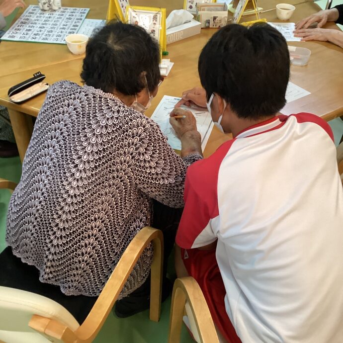 最初は緊張していた中学生も、次第に笑顔が見られるようになり、脳トレやリハビリに励まれる利用者様に積極的に声をかけていました。