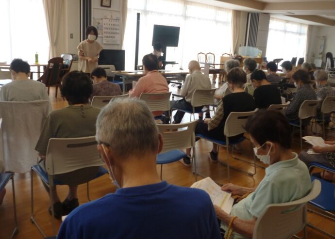 今日は午後より健康サロンが開催されました。「健康長寿の秘訣~ながーく元気でいるために~」というテーマで講師の先生を招いての講座です。ご入居の皆様、健康にはとても興味をもたれてあり、32名の方が参加されました。このように集まりの場に積極的に参加することも大切ですね。