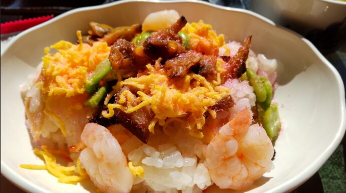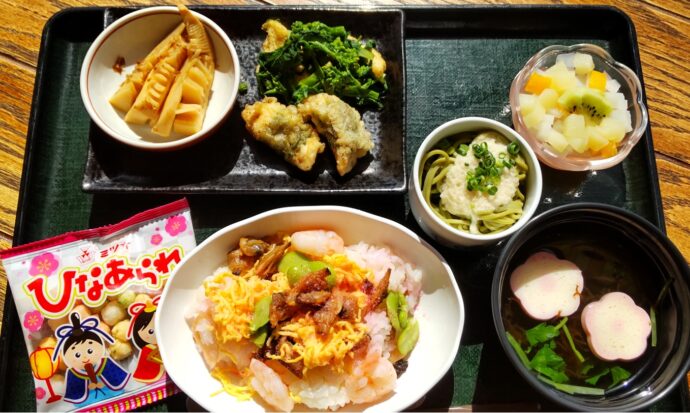 R5年3月3日(金)月に1度の特別料理、なしのき膳は「ひなまつり膳」 見た目から楽しめる工夫がされた賑やかな料理にしました。 担当 堀尾