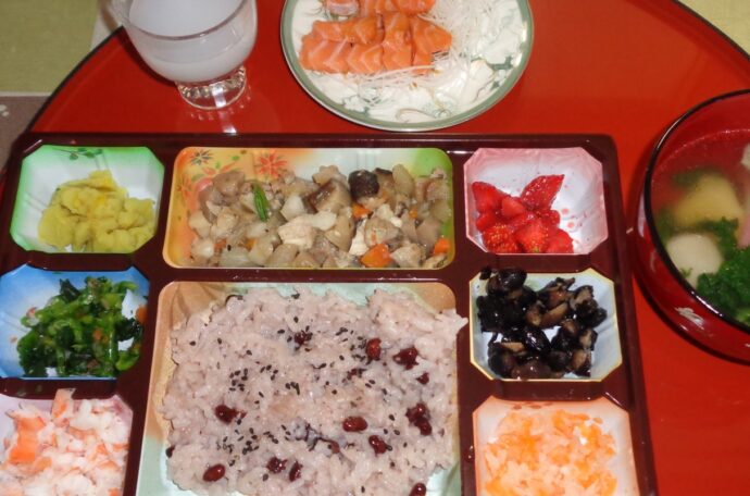 食べやすく刻んだお正月料理、お刺身と雑煮も添えられています。