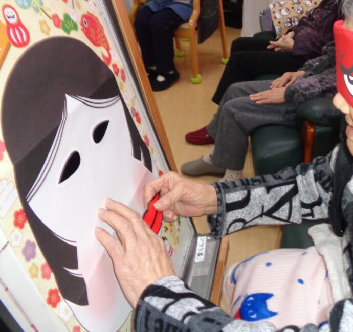 面白い目隠しを付けて各々が福笑い、どの顔も面白く、みんなが笑顔!