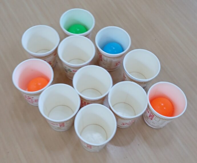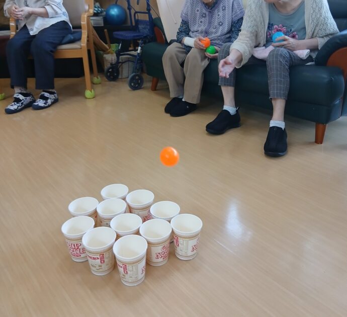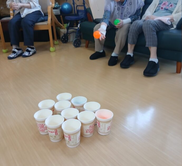 今日は、体操後、担当職員が考えたわくわくボール入れです。