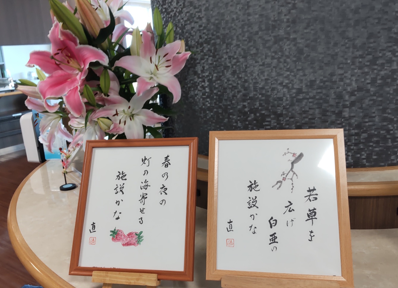 梨ノ木城の以前に俳句の先生をされていた入居者様が 季節ごとに俳句を施設にくださいます。 見ごろのカサブランカと共に・・・・春の作品を皆様もごらんください