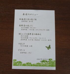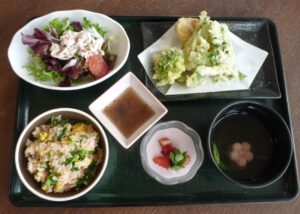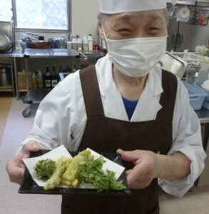 菜の花ごはん、春野菜の天ぷら(道の駅みなみの里さんの新鮮春野菜です!)彩り美しい春爛漫のお膳です。天ぷらは梨ノ木城ベテラン料理人の牧草さんがカラリと揚げてくれました。笑顔が素敵です。天ぷらもサックサクです!岩塩がパラリとかけられています。素材の味が引き立ちますね。