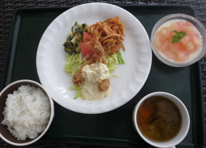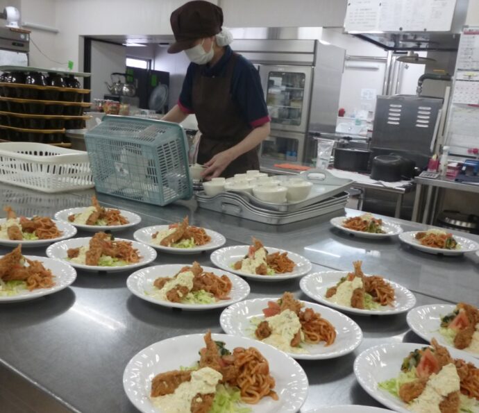 エビフライのタルタルソースも手作りです。隠し味に刻んだラッキョウも入れています。厨房職員さんは手際よく美味しいランチを仕上げていきます。