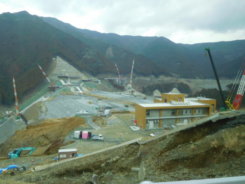 展望所で実際の現場を前に、ダムの構造、使われている粘土、石などの説明などが行われました。完成後の堤の高さはなんと139m!九州では最高の高さになります!
