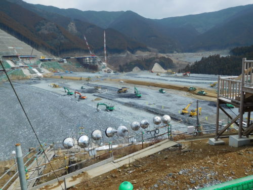 建設に使われている重機はどれも破格の大きさです。55tダンプはタイヤの大きさだけで2mを超えています。重機は大きすぎて道路を走ることができない(ナンバープレートさえありません)ので、ばらばらに分解して現場に運び込むのだそうです。そのような巨大重機が大活躍していましたが、展望所から見るとプラモデルのように小さい!ため息が出る光景でした。