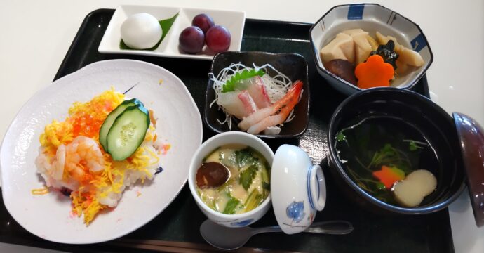 ~お品書き~ ちらし寿司 炊き合わせ 刺身 茶碗蒸し すまし汁 デザート