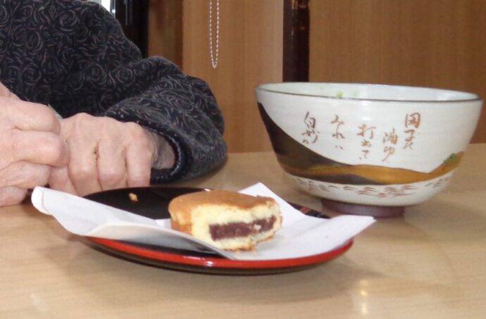 職員がお茶をたて、お菓子を添えて食べて頂きました。