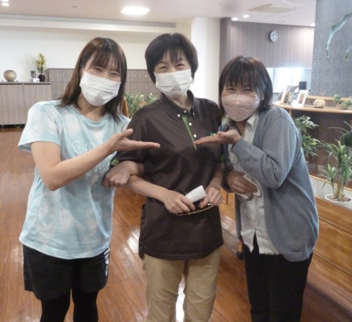 「お店みたいな美味しさです」と喜んで頂きました(^^♪ 担当は平井副主任です。今回は事務所の橋本リーダーとデイサービスTakeTakeヒルズの占部さんと3人一緒にパシャリ📷楽しそうな職場でしょう?楽しいですよ~
