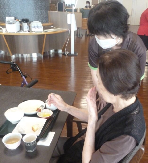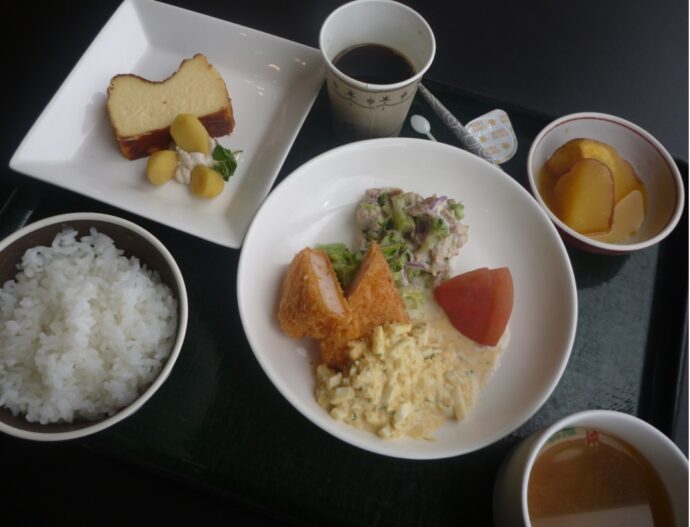 お膳は秋色ですね。栗、さつま芋、そして手作りのベイクドチーズケーキ。 入居の方にも感想をお尋ねします。