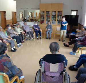 グループホーム愛らんどでは、毎日、健康づくりとして14時から15時の1時間を体操&レクレーション実施しています。 14時00分 お名前を呼んで挨拶