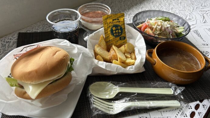 今回のメニューは、(ハンバーガー、シャカポテ、サラダ、オニオンスープ、ティラミス)でした。