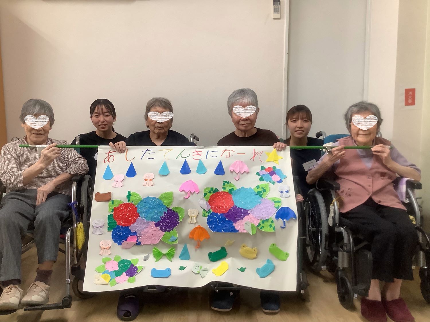 テーマは梅雨☔🐌アジサイは貼り絵でアレンジし、傘やカエル、カタツムリなどは利用者様と一緒に折り紙で作りました。