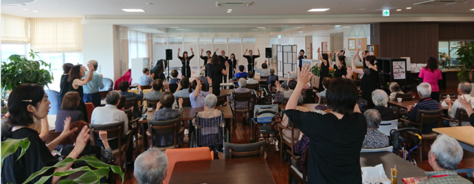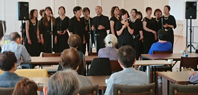 6月8日、梨ノ木城 1Fダイニングホールをステージにしてゴスペルのグループの方々が コンサートに来てくれました。ゴスペルの神聖な歌声で懐かしい昔の曲が流れると一緒に口づさんだり 手拍子、曲によっては踊る方も・・・みんなで楽しんだ時間でした。