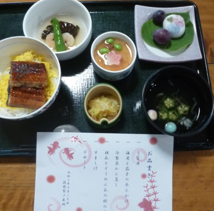 「8月なしのき膳」はうなぎが主役!スタミナがつきますね。冷製茶碗蒸しやそうめん瓜は夏には嬉しい涼やかなメニューです。