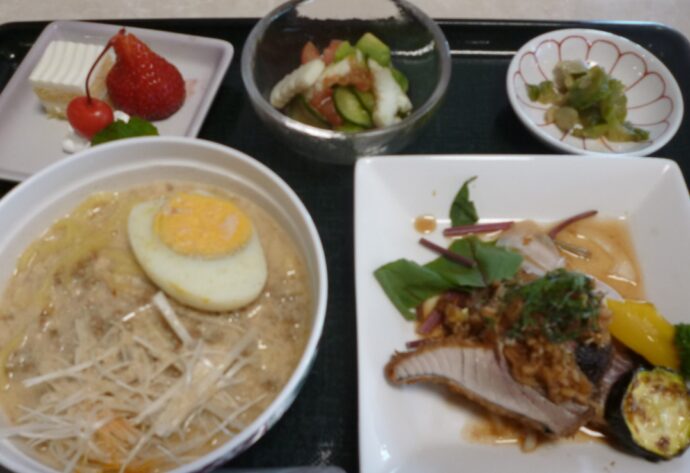 毎日の食事は「生きるため」そして「楽しむため」に大切な役割を果たしています。梨ノ木城の食事は美味しいです。はっきり言います「美味しいです!」。しかし、課題もあります。それは麵料理です。熱々のラーメンやうどんを食べたい!との声を頂きます。多くのご入居者様へ熱々をお届けするためには時間が勝負です。今回は担々麺にチャレンジ!熱々を!!!今回は、召し上がる直前にスープをホールで(厨房職員さんが2名体制で)つぎ、パートさん、事務所職員でスピーディーに配膳するというサービスを行いました。