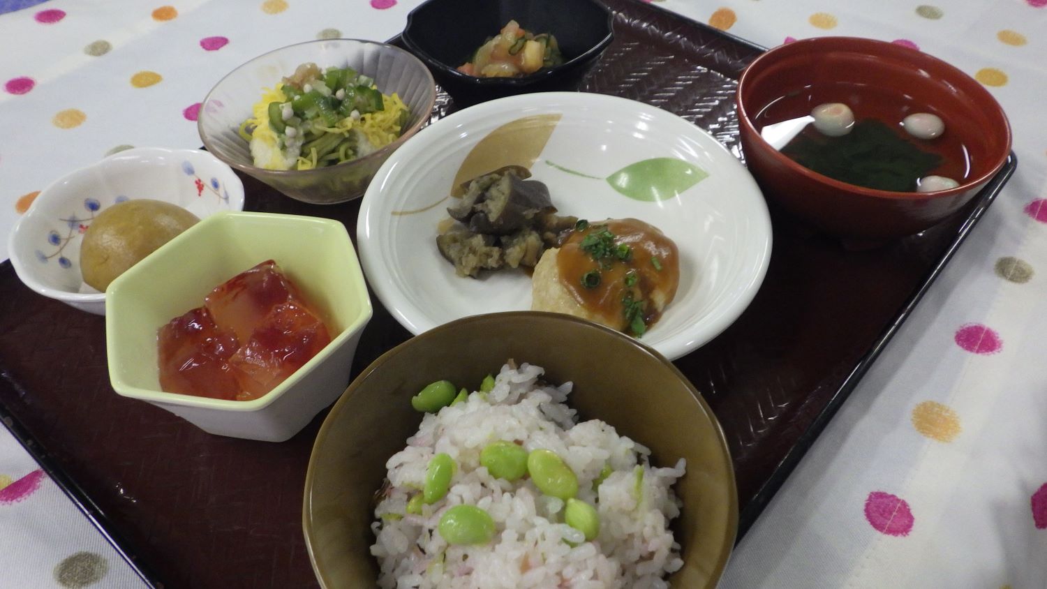 ご飯は梅しそを混ぜて、枝豆をトッピングし鮮やかにさっぱり仕上げました。