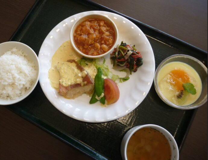 5月4日みどりの日、梨ノ木城のランチタイム、コーヒーの香りが漂います。デザートは厨房の古賀さん手作りのオレンジヨーグルトムースです。添えられたミントの葉は、なしのき畑で収穫されたものです。