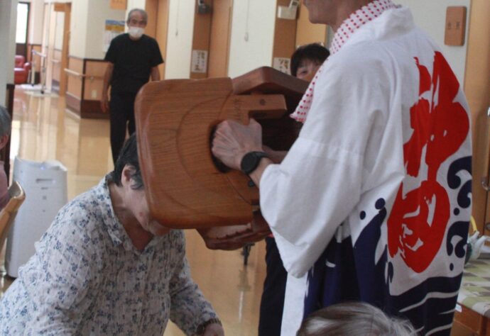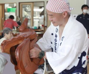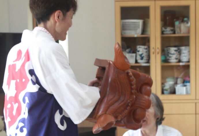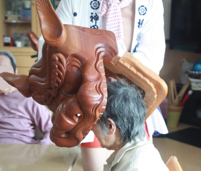 甘木祇園祭の獅子入れで地元の方々が木彫りの獅子頭をもって「愛らんど」に来てくれました。 頭を獅子頭であま噛みしてもらうと元気に過ごせるそうです。 獅子入れに来て下さりありがとうございました。